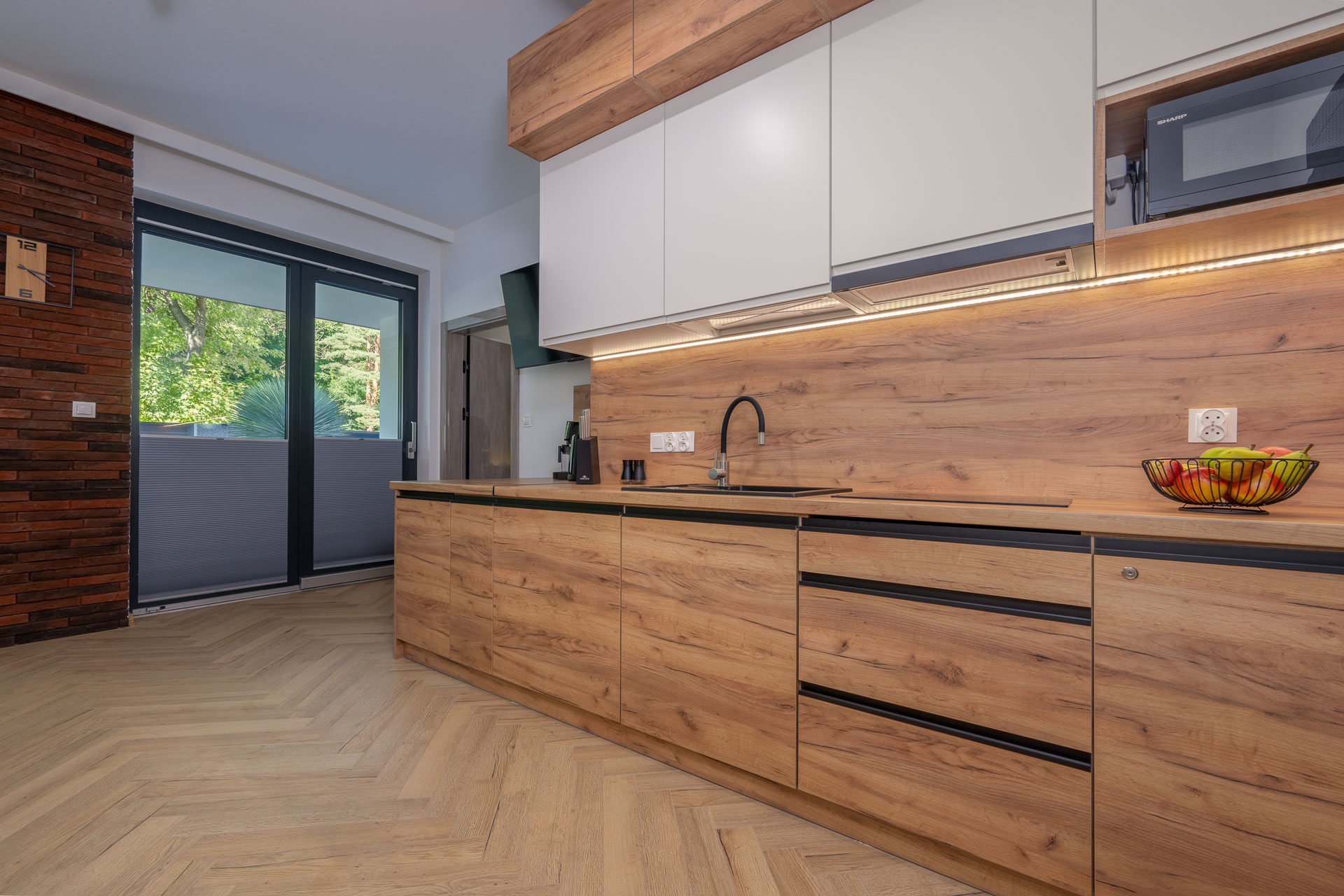 Aneks kuchenny wyposażony jest w płytę ceramiczną z dwoma polami, lodówkę, zmywarkę, kuchenkę mikrofalową, czajnik, ekspres do kawy oraz zastawę stołową, garnki do gotowania i inne akcesoria kuchenne.