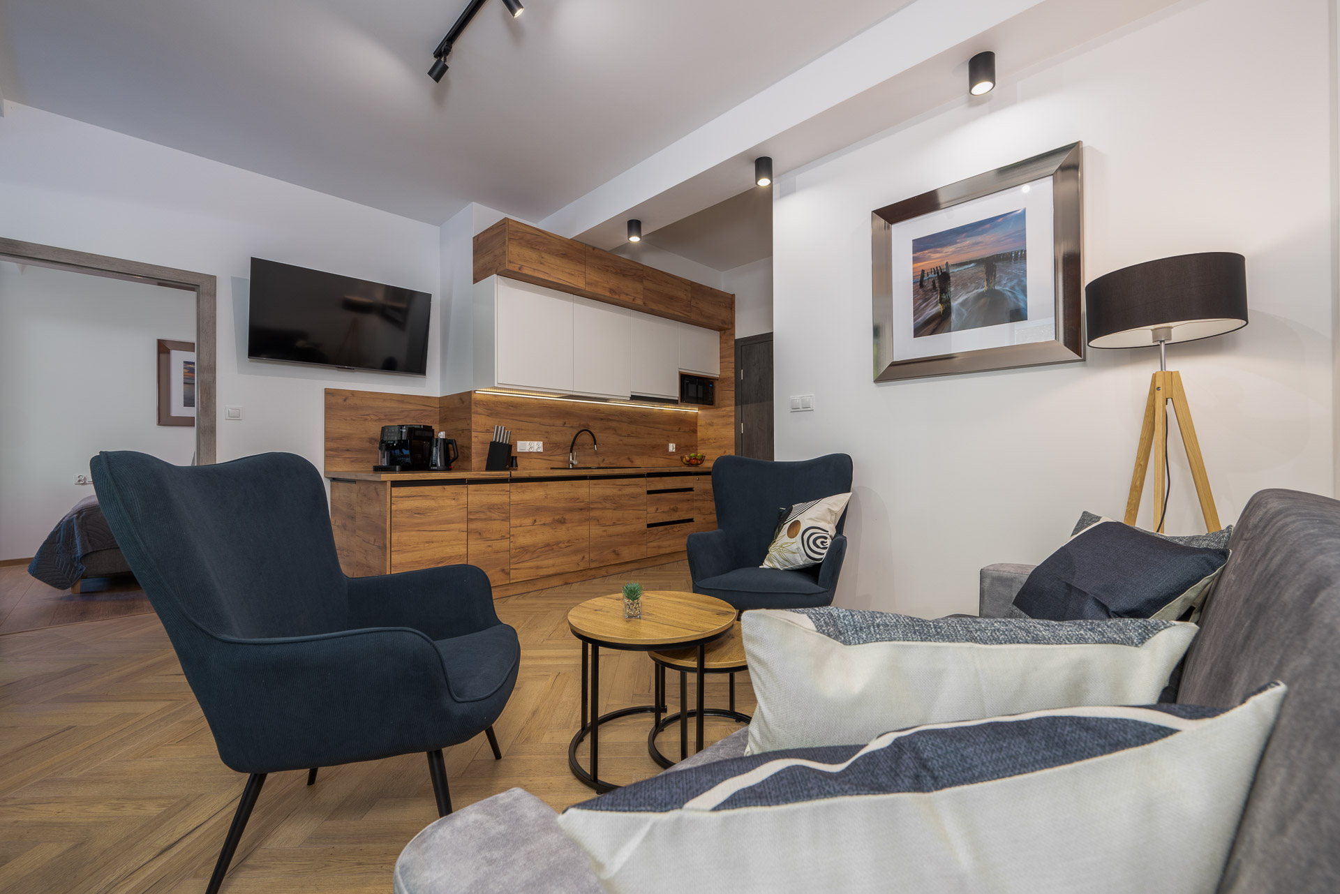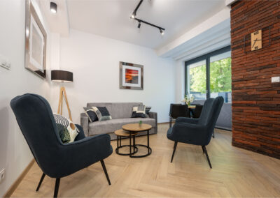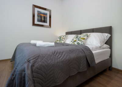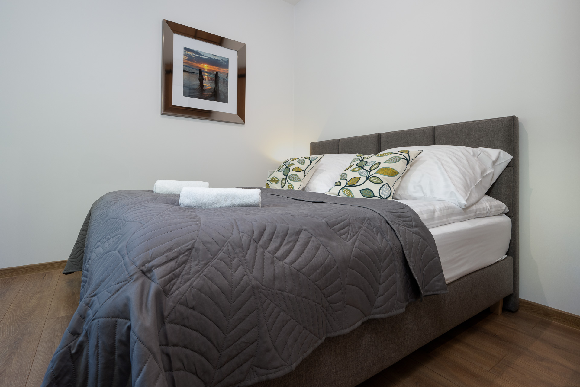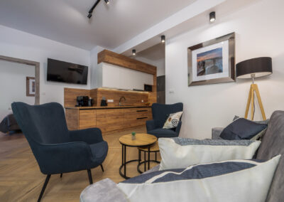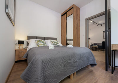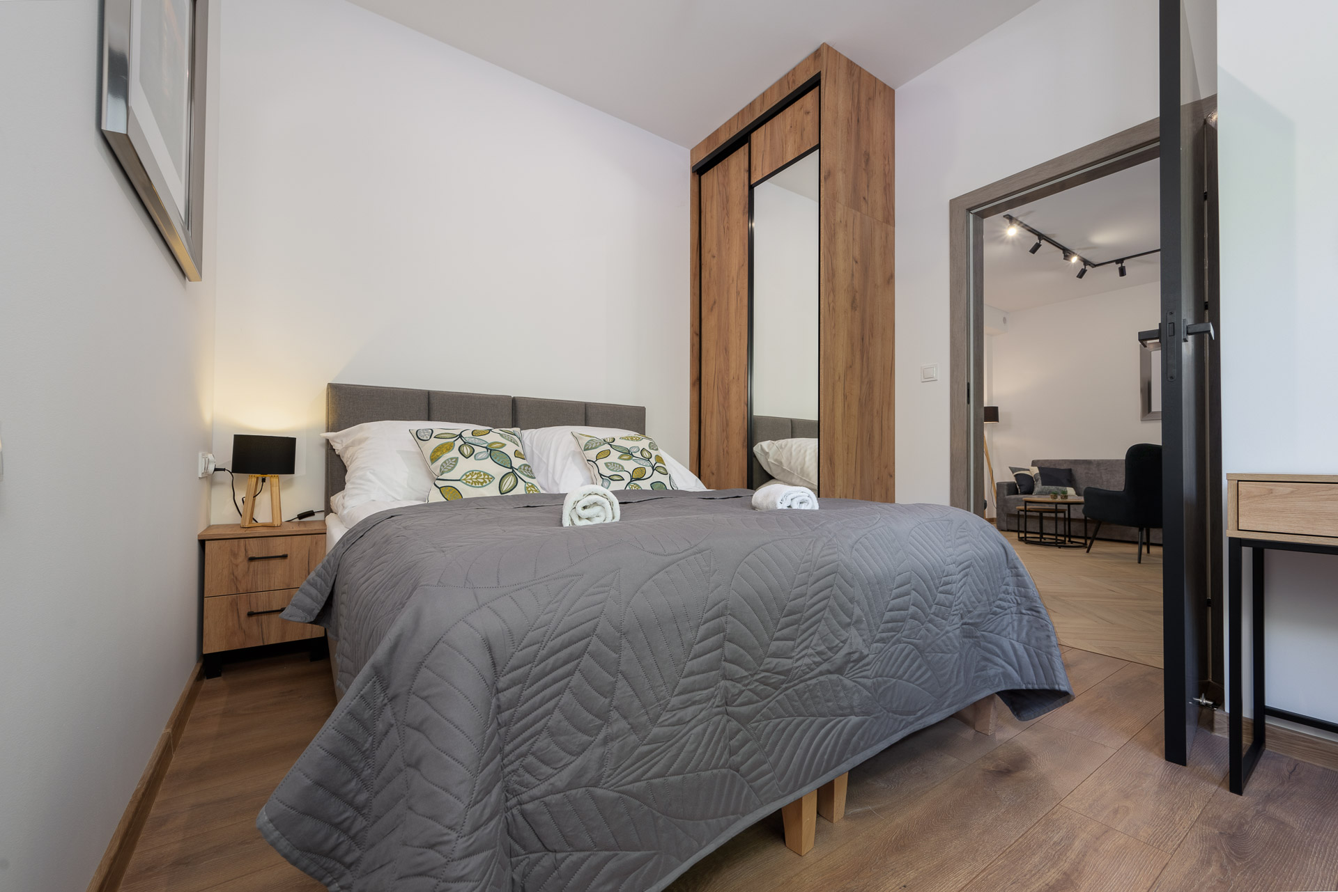 Wyposażony w jedno łóżko małżeńskie oraz rozkładaną  dwuosobową kanapę w salonie, stolik kawowy, stół z 4 krzesłami, telewizor z płaskim ekranem w systemie smart TV. W sypialni znajduje się również szafa oraz biurko idealne do pracy z komputerem.