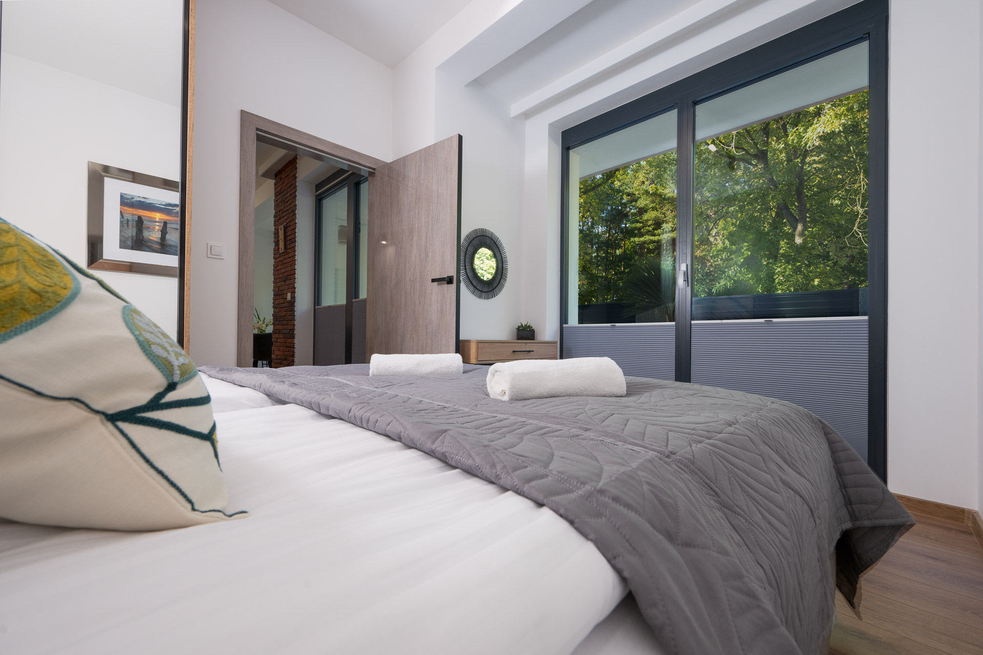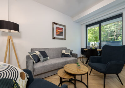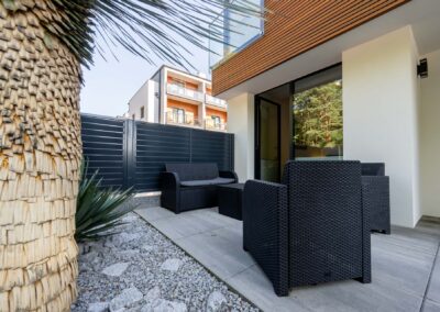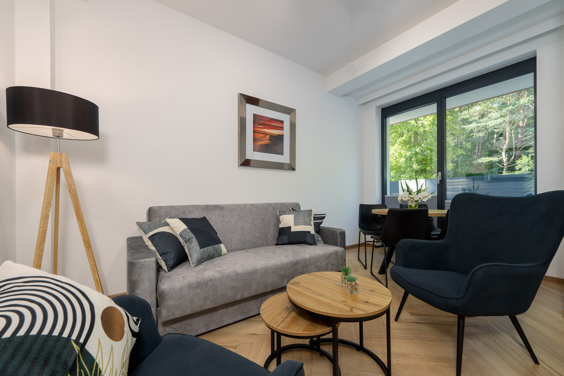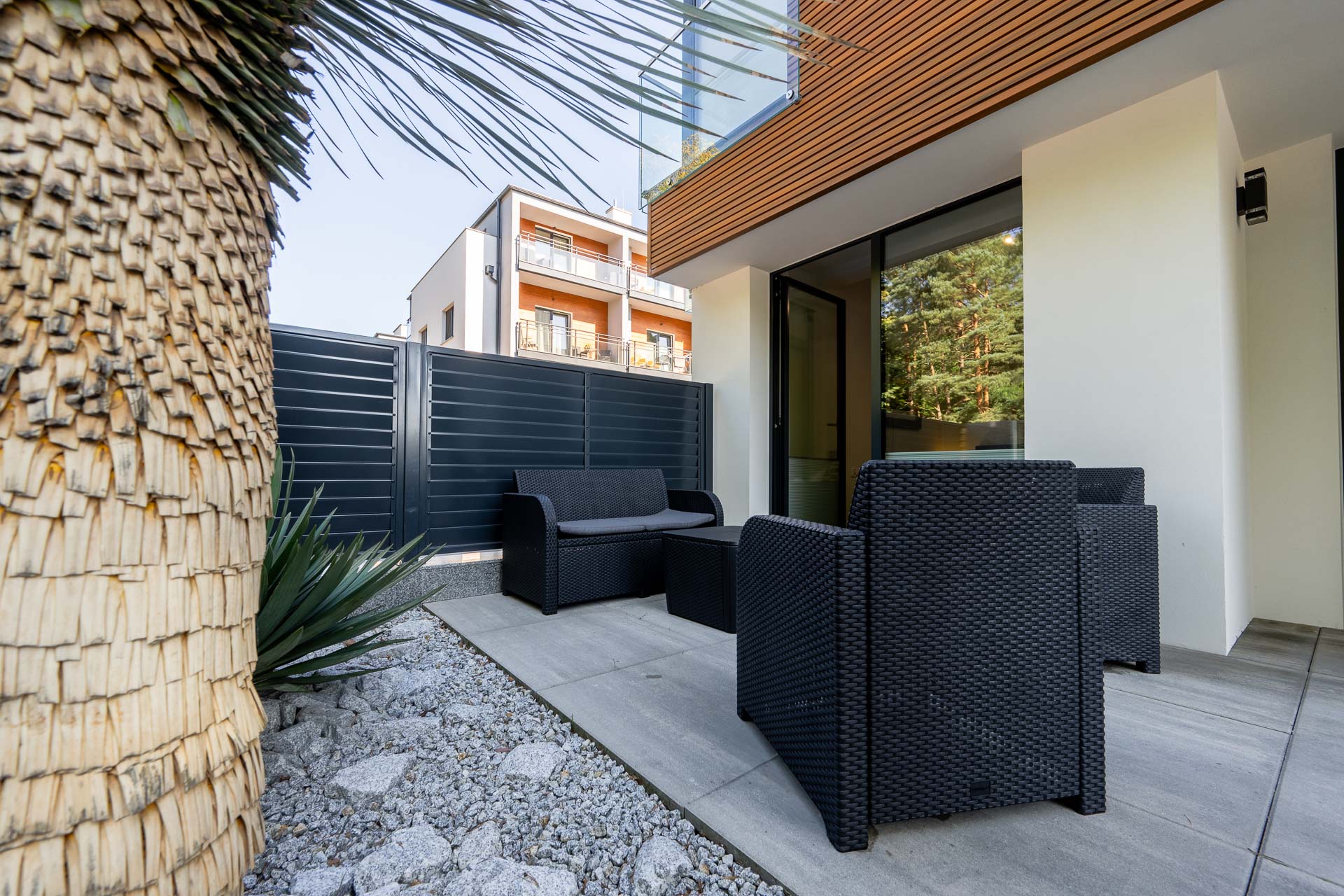 Stylowy, funkcjonalny, zapewniający wygodę i spokój w sercu Jastrzębiej Góry, dwupokojowy apartament, z jedną sypialnią, przestronnym salonem z aneksem kuchennym oraz dużym tarasem z meblami ogrodowymi, prywatną łazienką, zlokalizowany na parterze od strony morza. Przeznaczony dla maks. 4 osób.