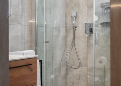 Łazienka z kabiną prysznicową, umywalką i wc.
