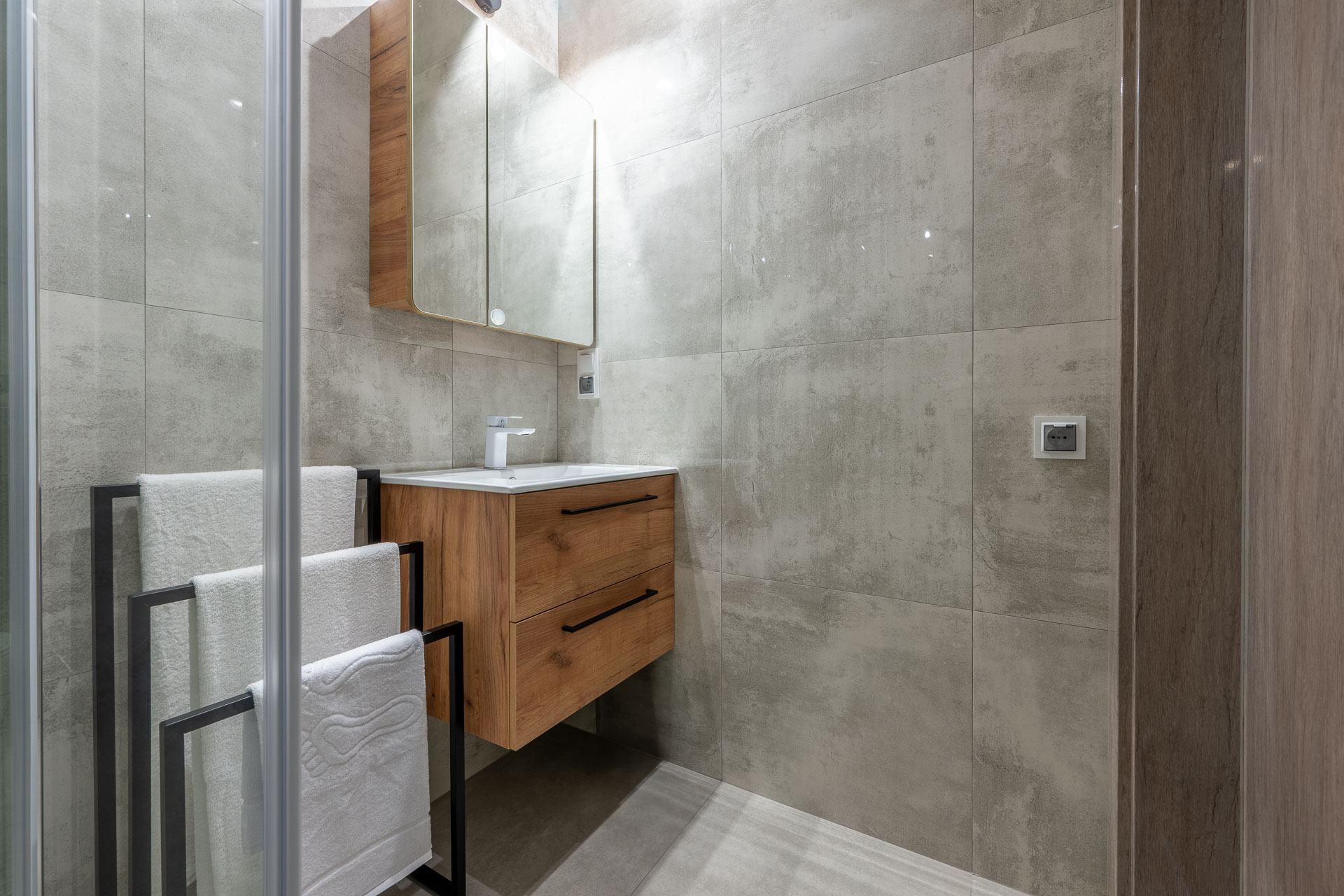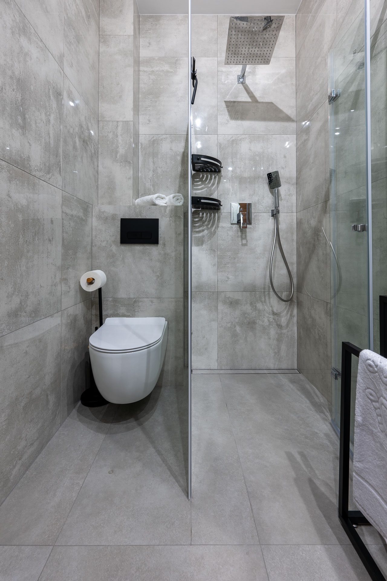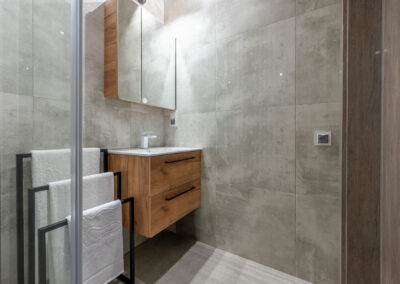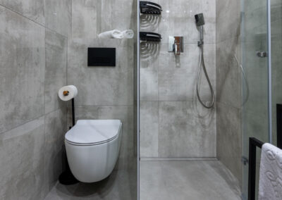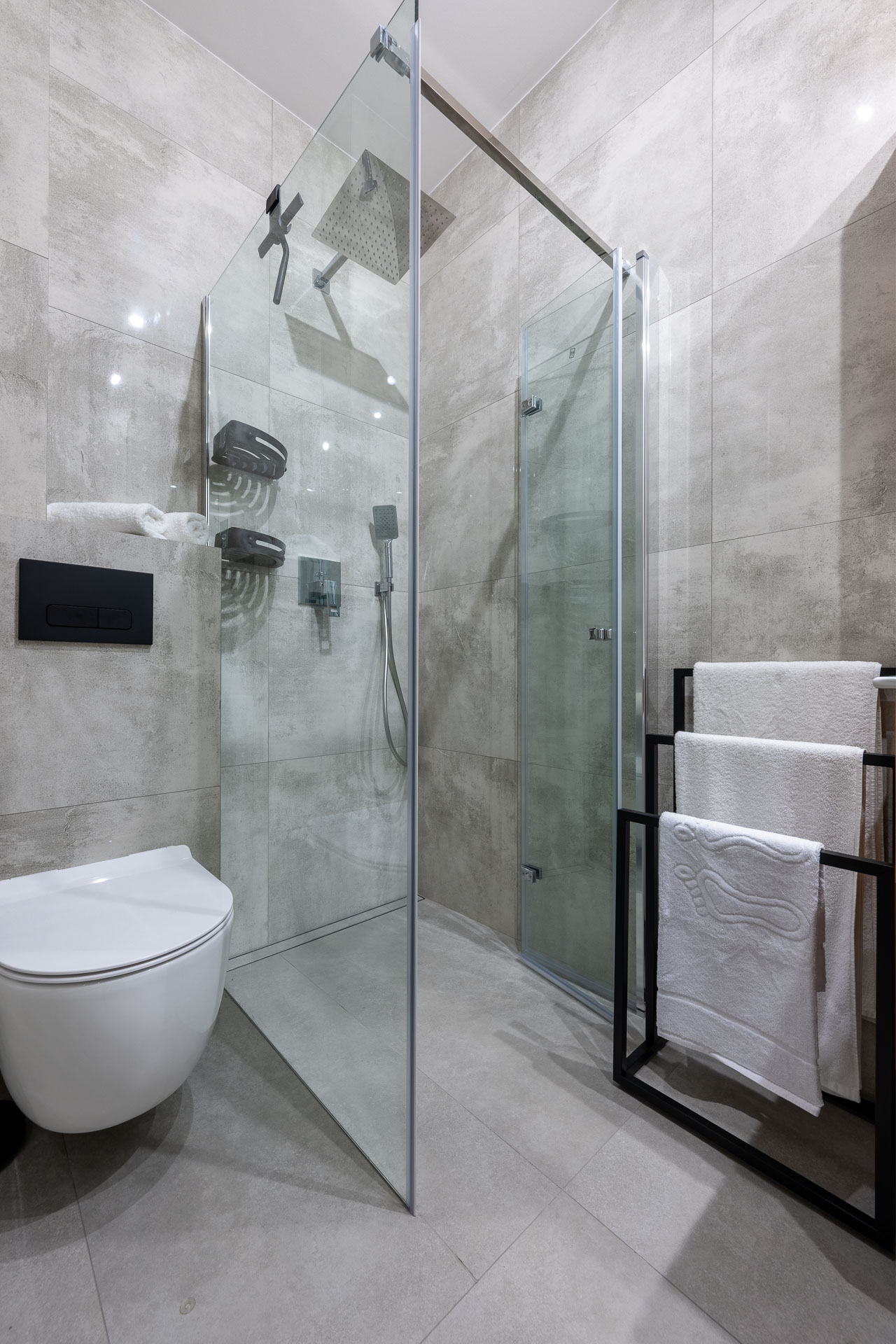 Łazienka z kabiną prysznicową, umywalką i wc.