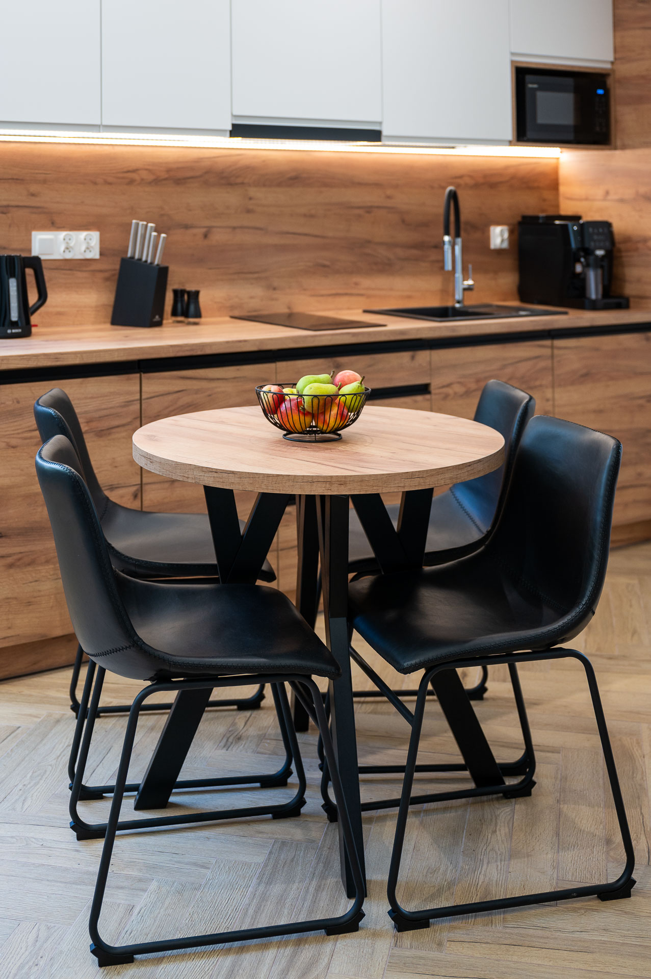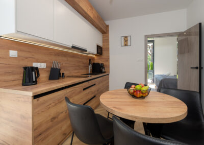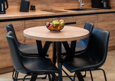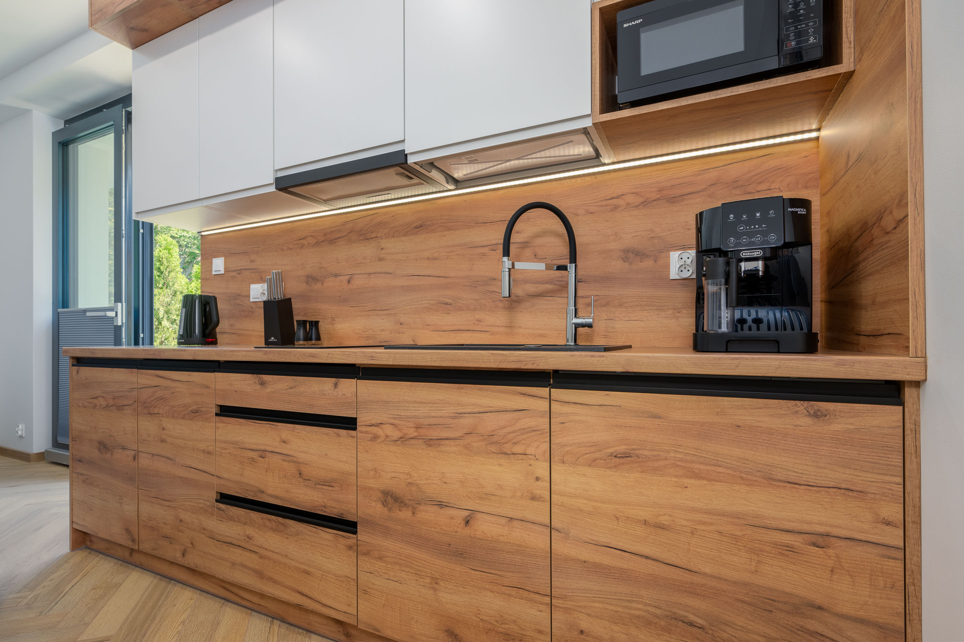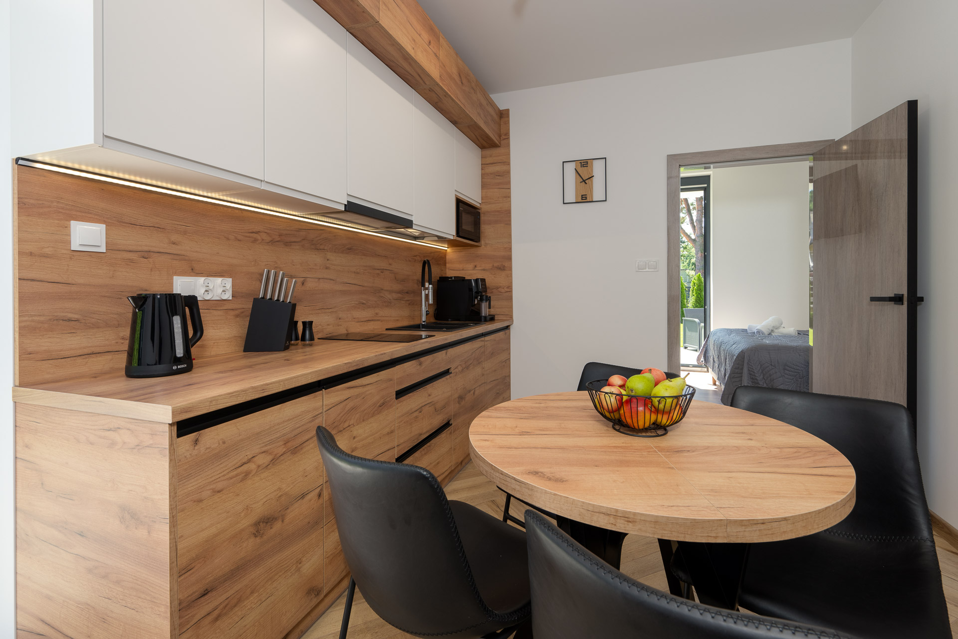 Aneks kuchenny wyposażony jest w płytę ceramiczną z dwoma polami, lodówkę, kuchenkę mikrofalową, zmywarkę, czajnik, ekspres do kawy oraz zastawę stołową, garnki do gotowania i inne akcesoria kuchenne.