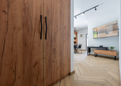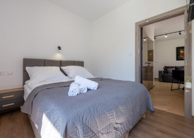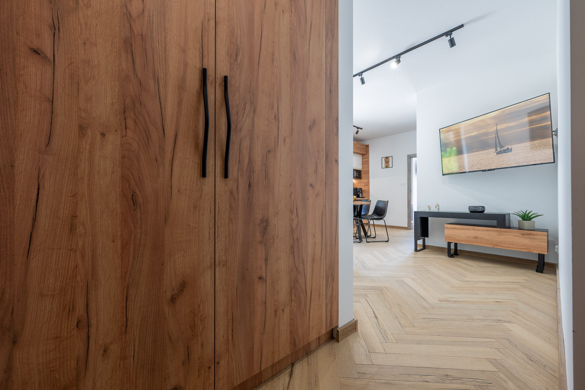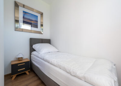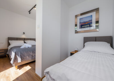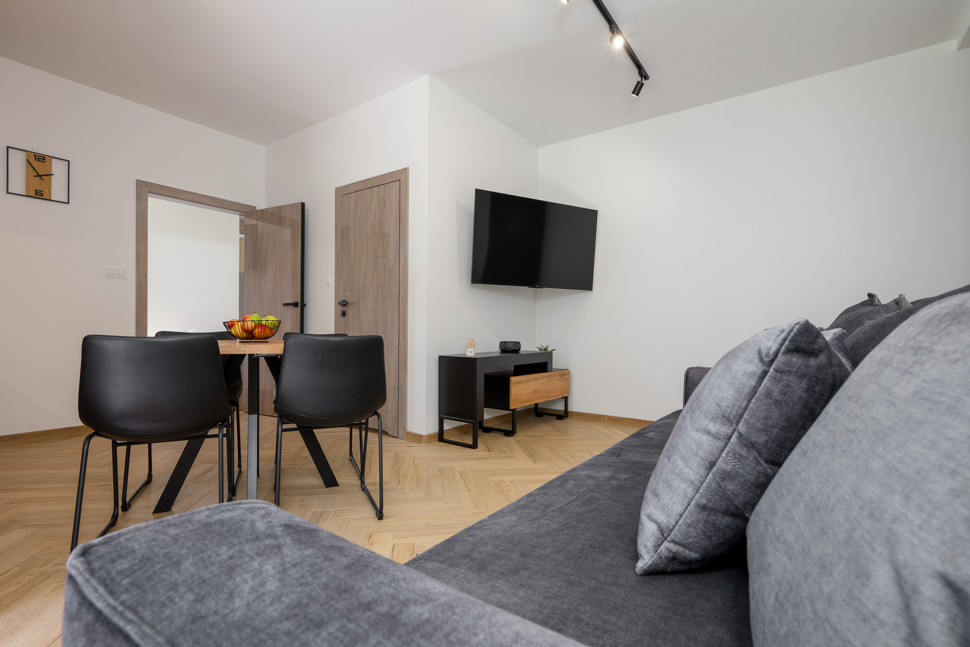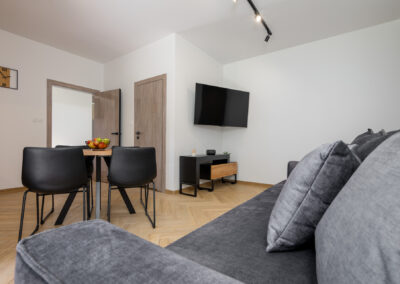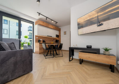 Wyposażony w jedno szerokie łóżko małżeńskie oraz rozkładaną  dwuosobową kanapę w salonie, stolik kawowy, stół z 4 krzesłami, komodę, pojemną szafę oraz dwa  telewizory z płaskim ekranem w systemie smart TV, jednym w salonie  i drugim w sypialni.