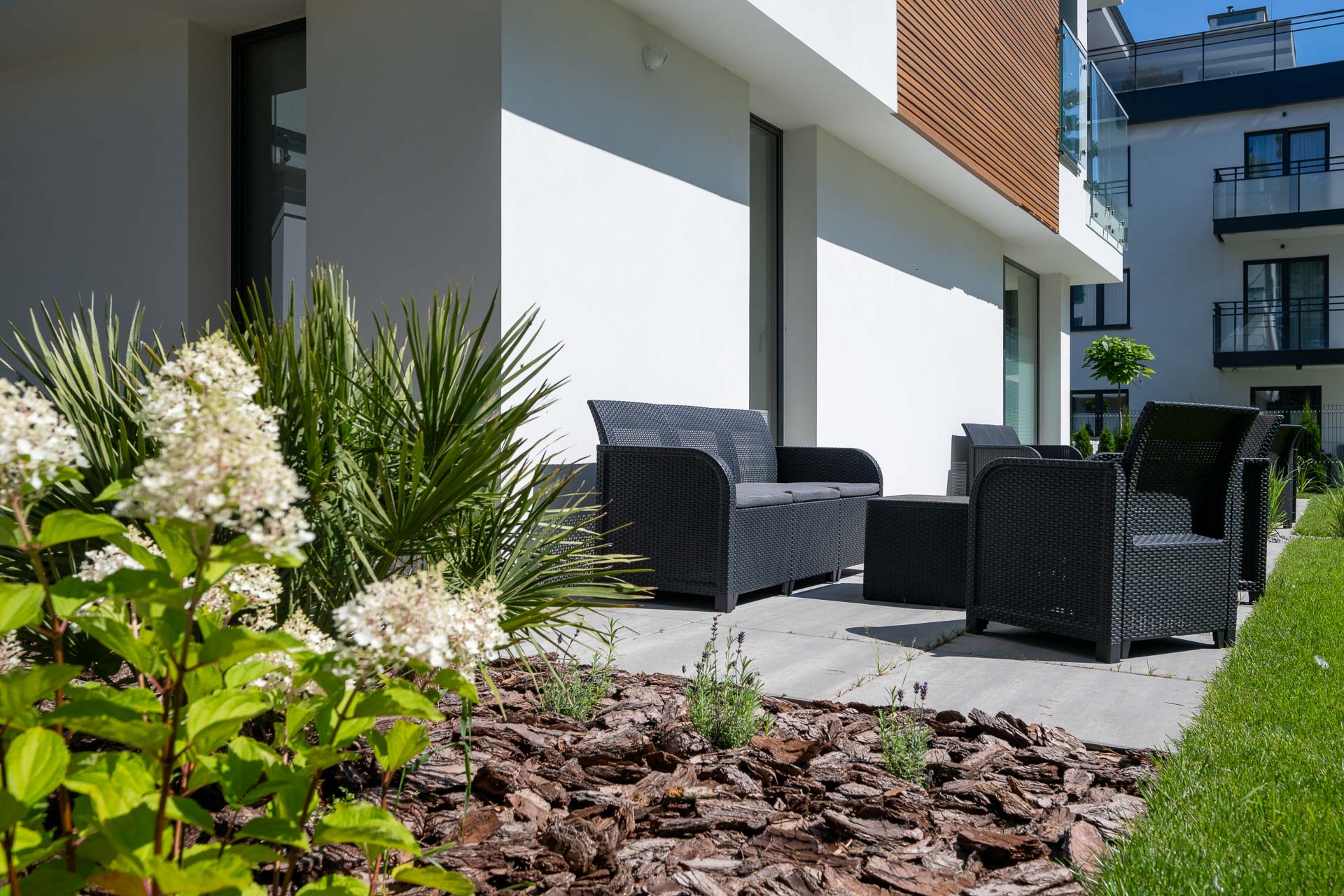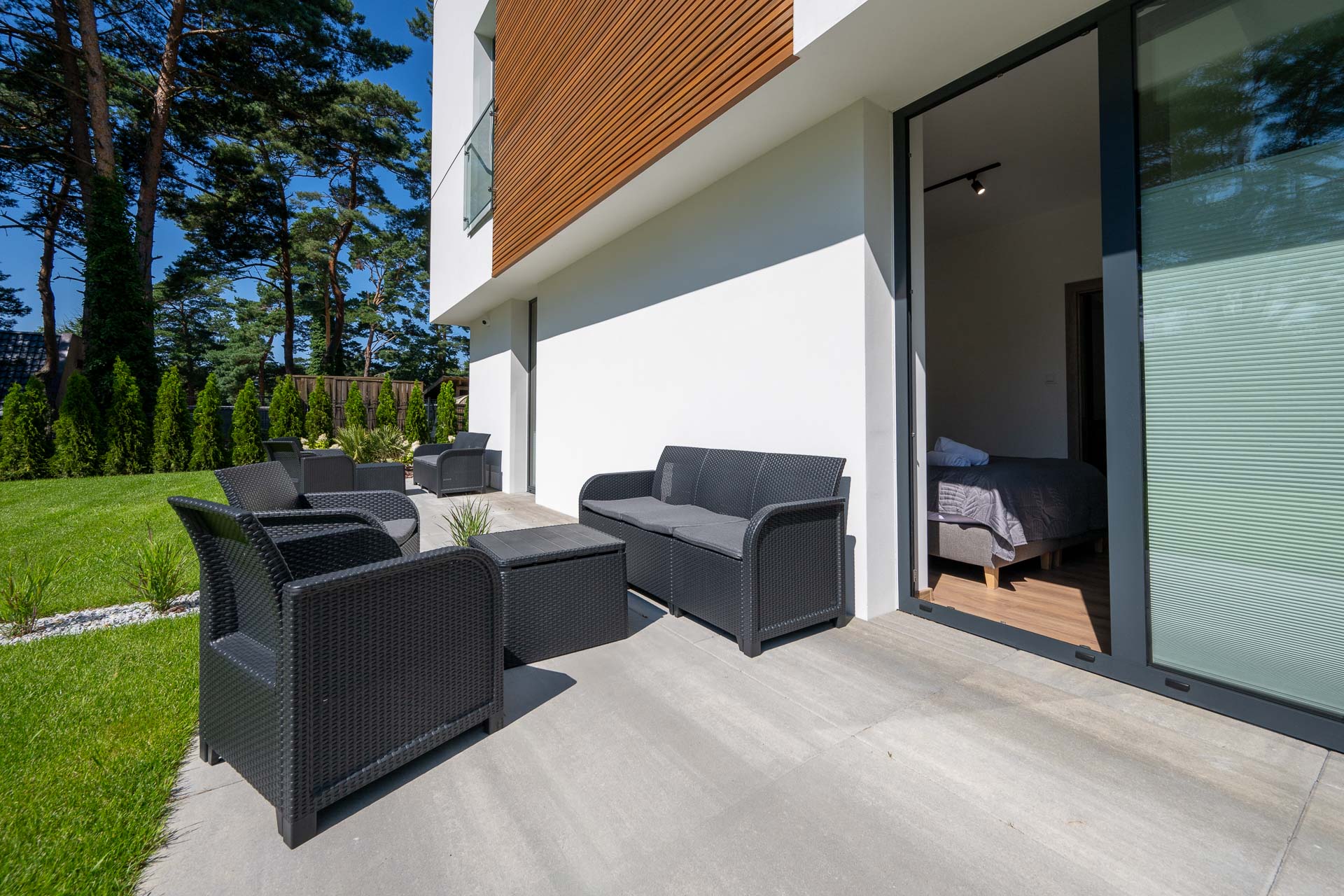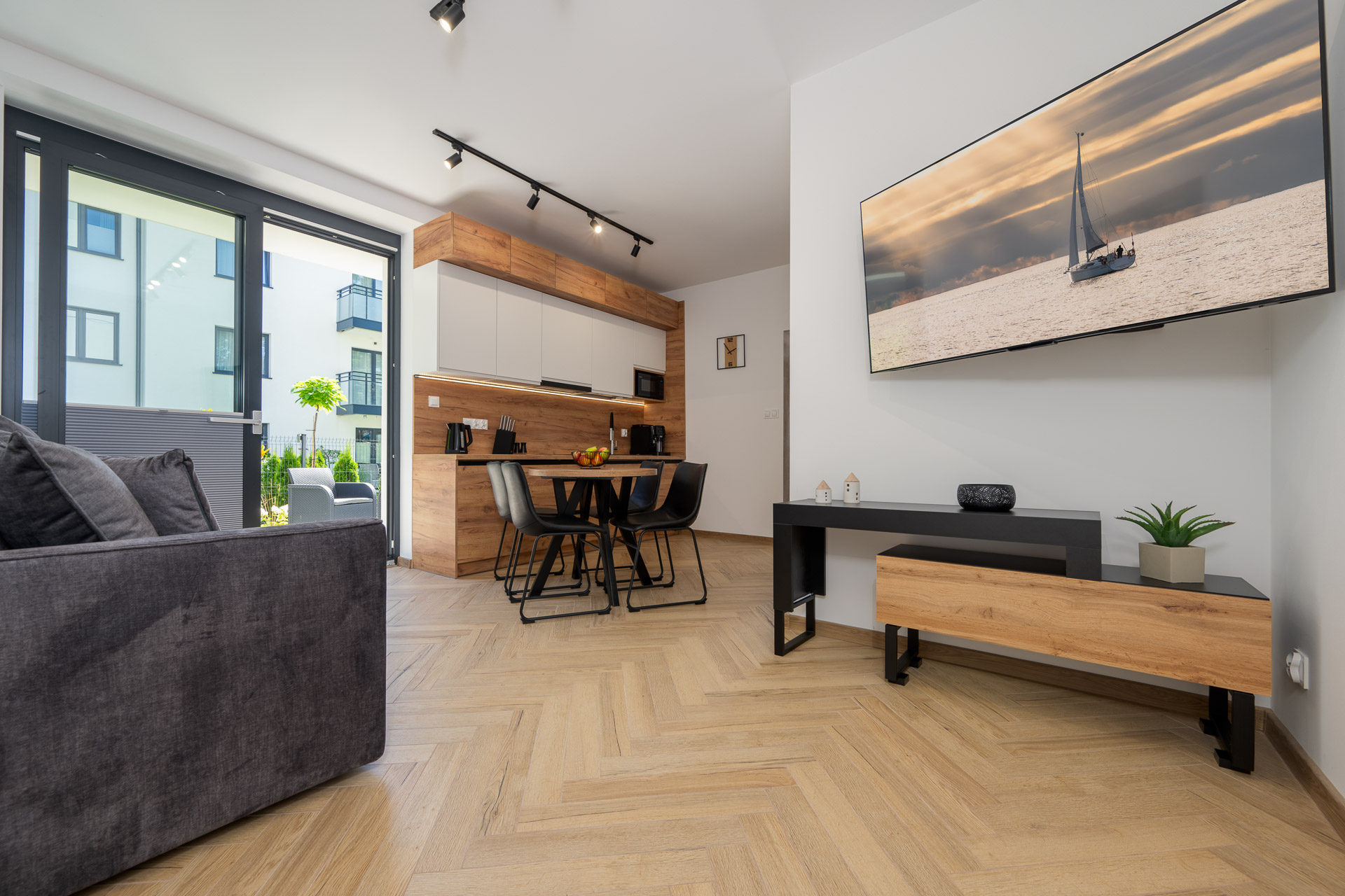 Stylowy, funkcjonalny, zapewniający wygodę i spokój w sercu Jastrzębiej Góry dwupokojowy apartament z jedną sypialnią, przestronnym salonem z aneksem kuchennym oraz dwoma tarasami z meblami ogrodowymi, prywatną łazienką,  zlokalizowany na parterze od strony ogrodu. Przeznaczony dla maks. 4 osób.