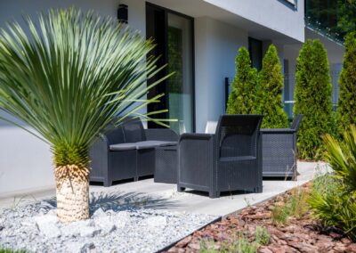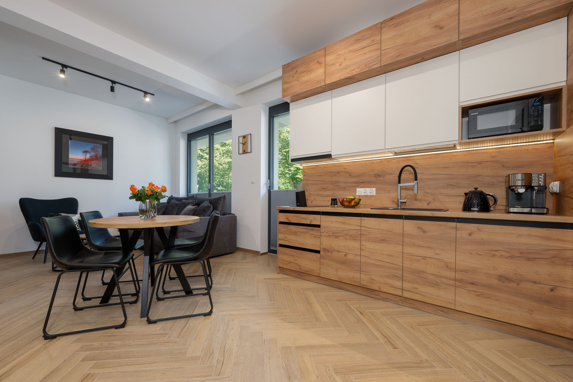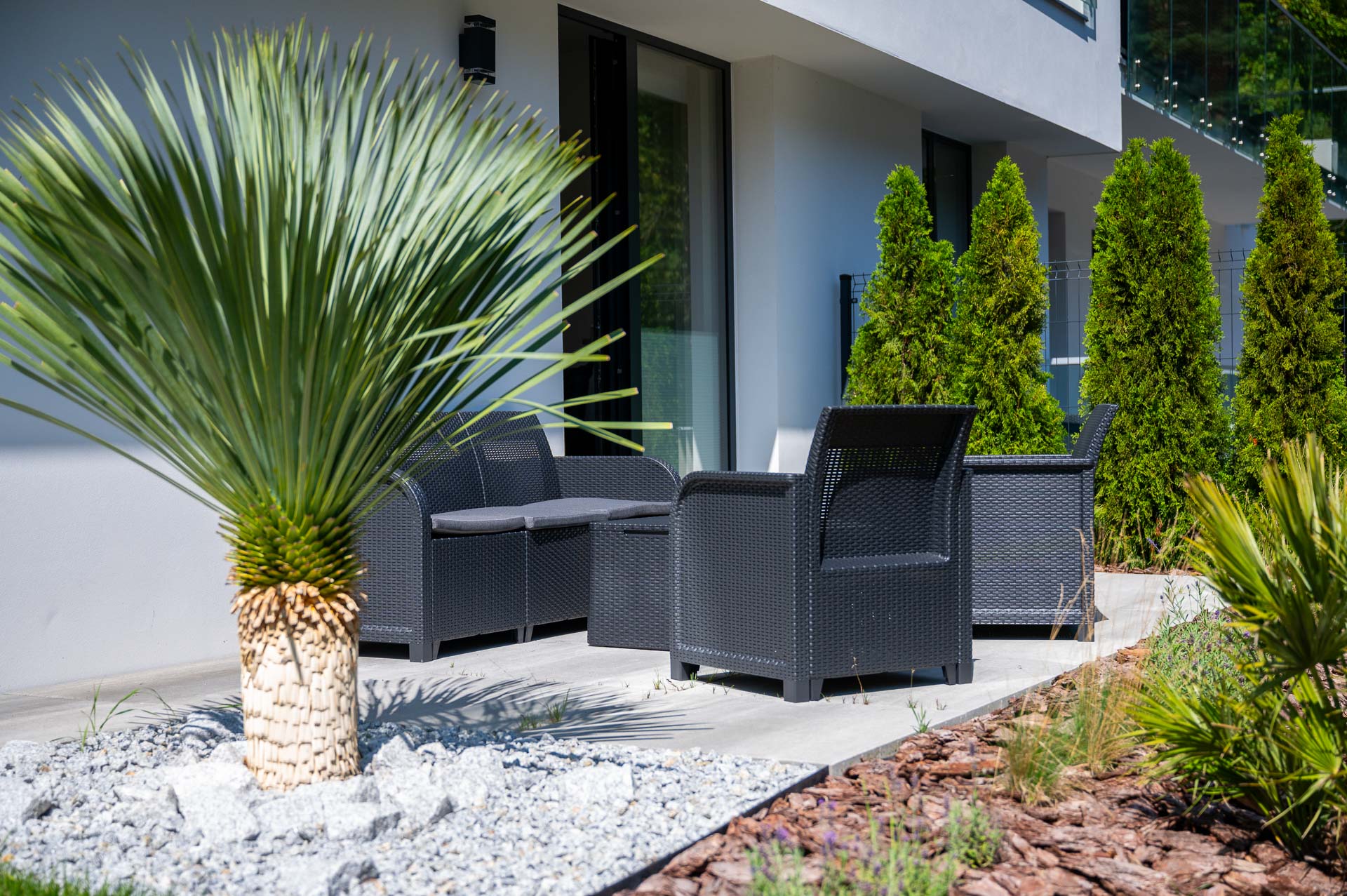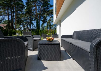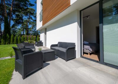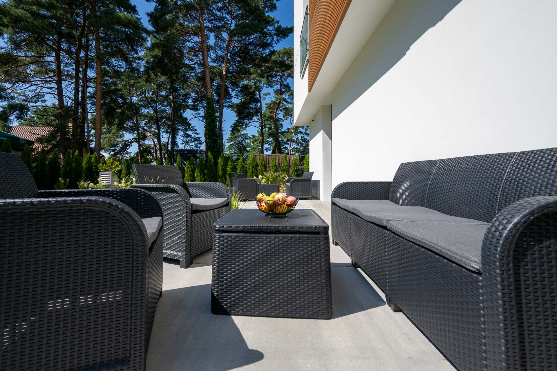 Stylowy, funkcjonalny, zapewniający wygodę i spokój w sercu Jastrzębiej Góry dwupokojowy apartament z jedną sypialnią, przestronnym salonem z aneksem kuchennym oraz dwoma tarasami z meblami ogrodowymi, prywatną łazienką,  zlokalizowany na parterze od strony ogrodu. Przeznaczony dla maks. 4 osób.