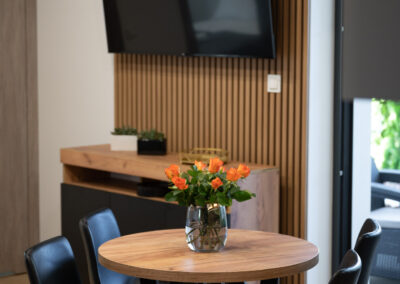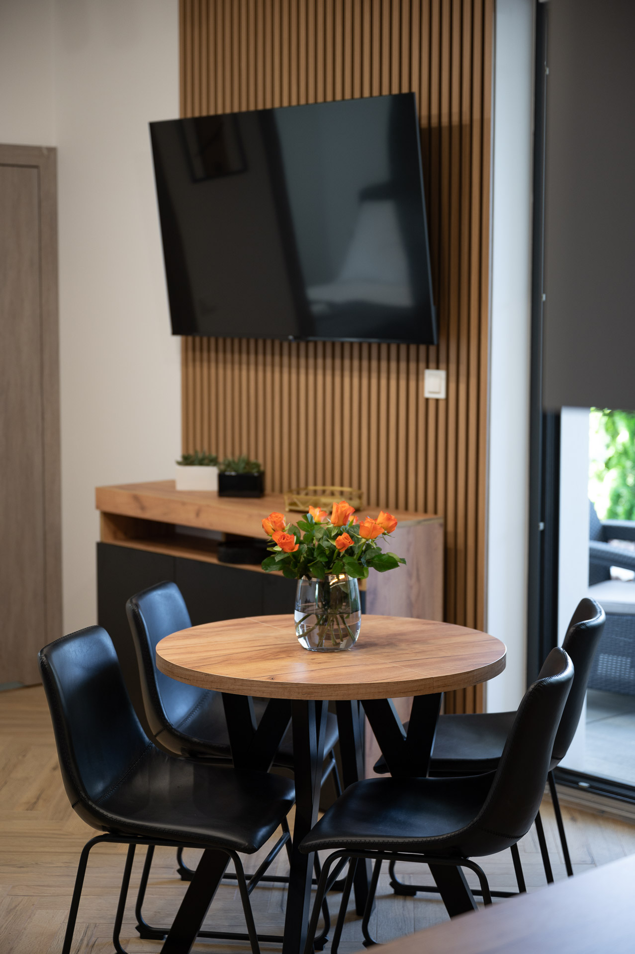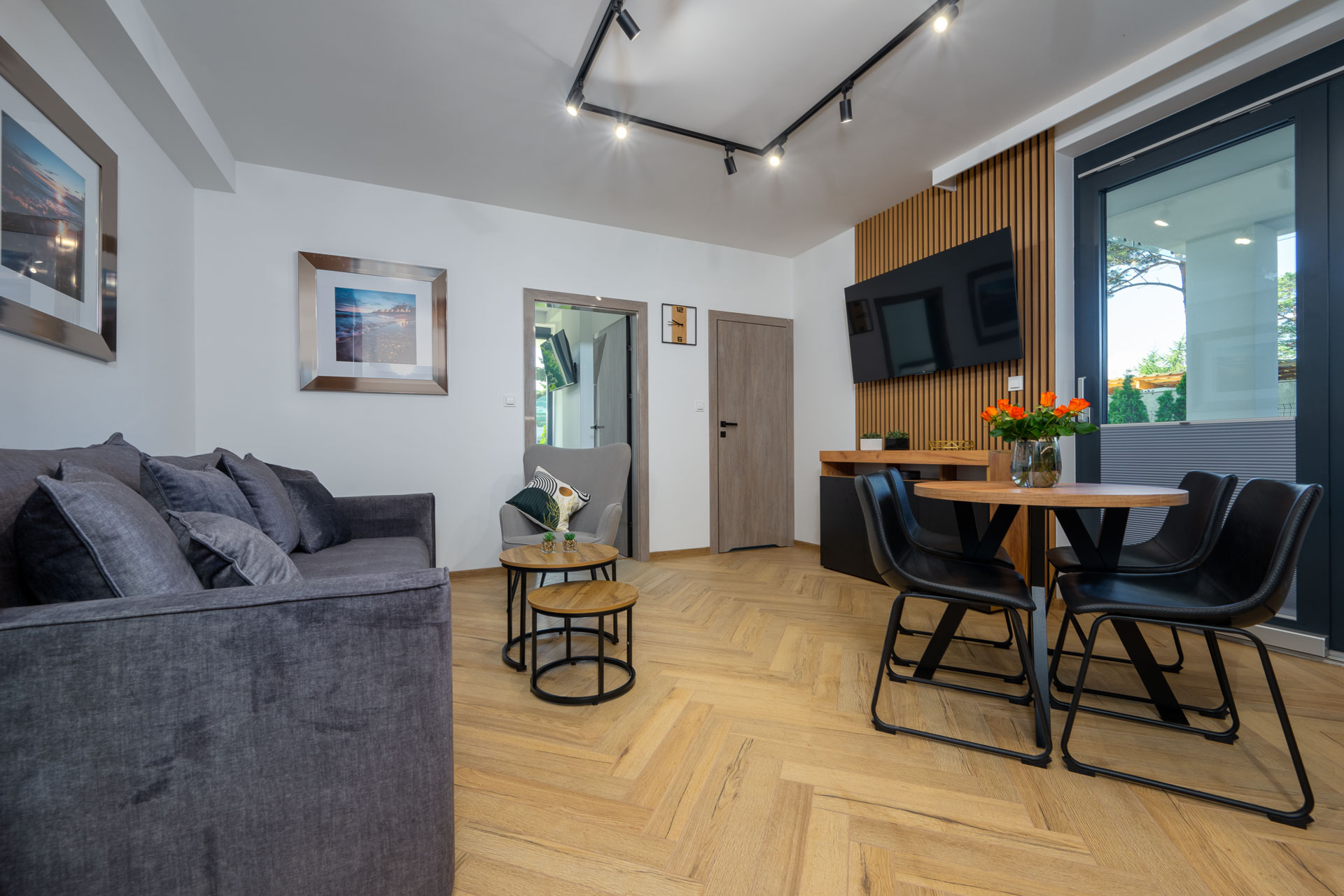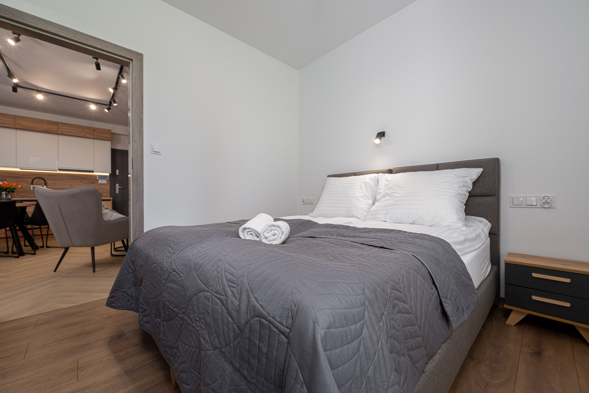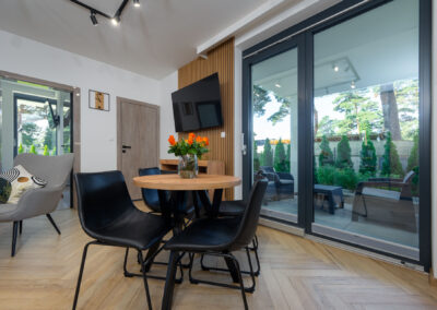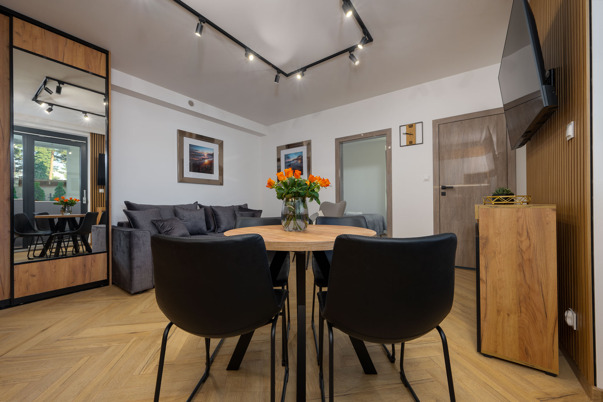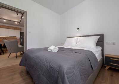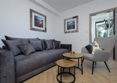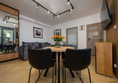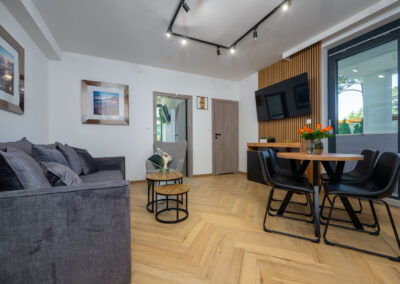Wyposażony w jedno szerokie łóżko małżeńskie oraz rozkładaną  dwuosobową kanapę w salonie, stolik kawowy, stół z 4 krzesłami, komodę, pojemną szafę oraz dwa  telewizory z płaskim ekranem w systemie smart TV, jednym w salonie  i drugim w sypialni.