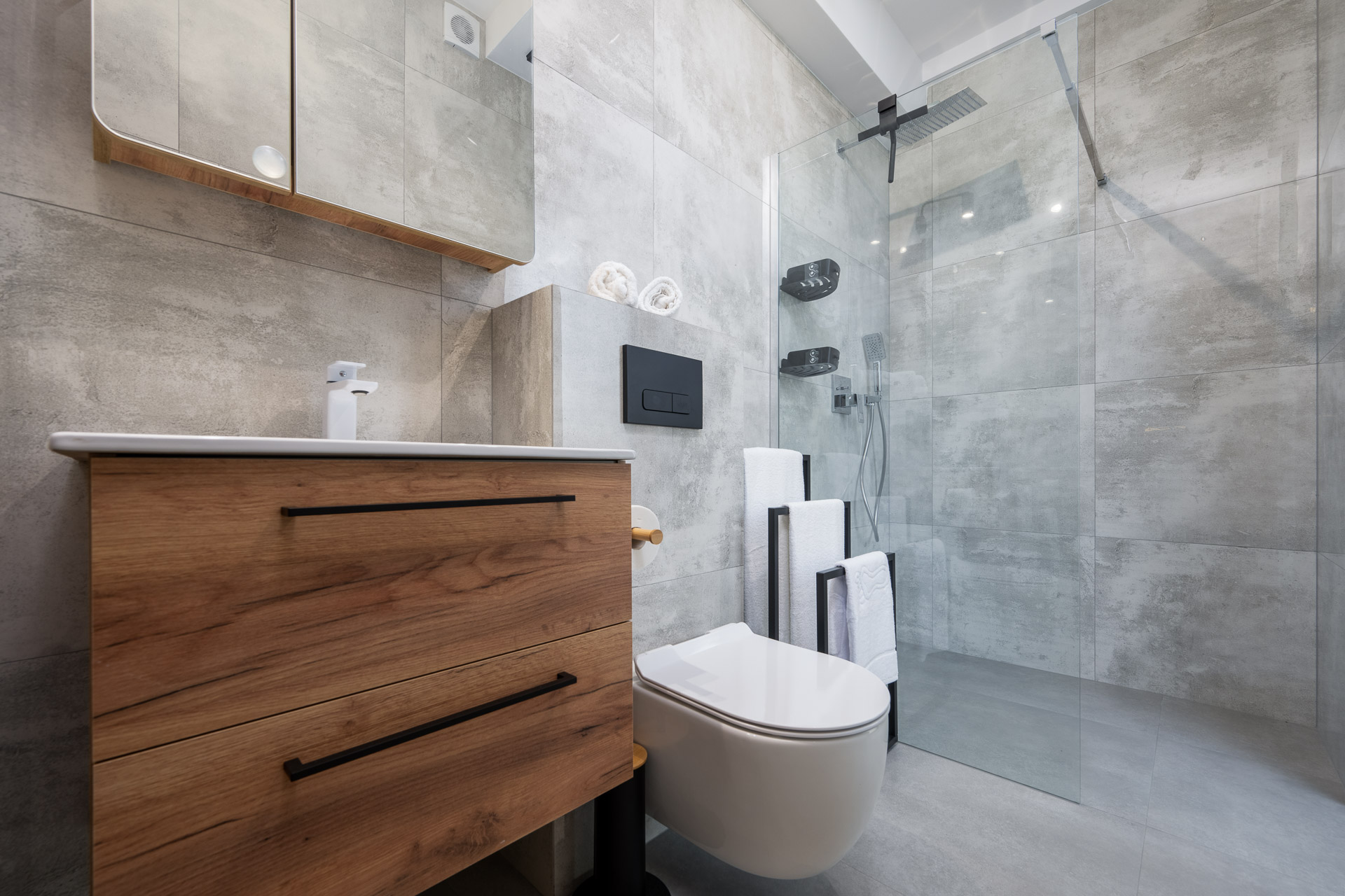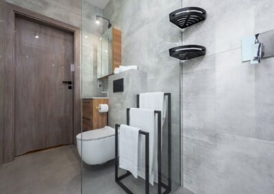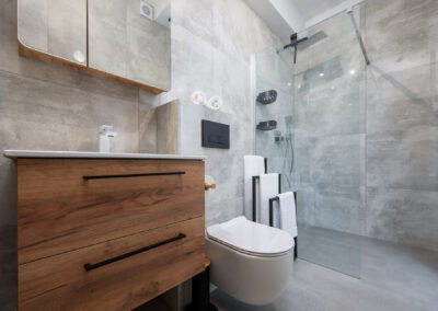 Łazienka z kabiną prysznicową, umywalką i wc.