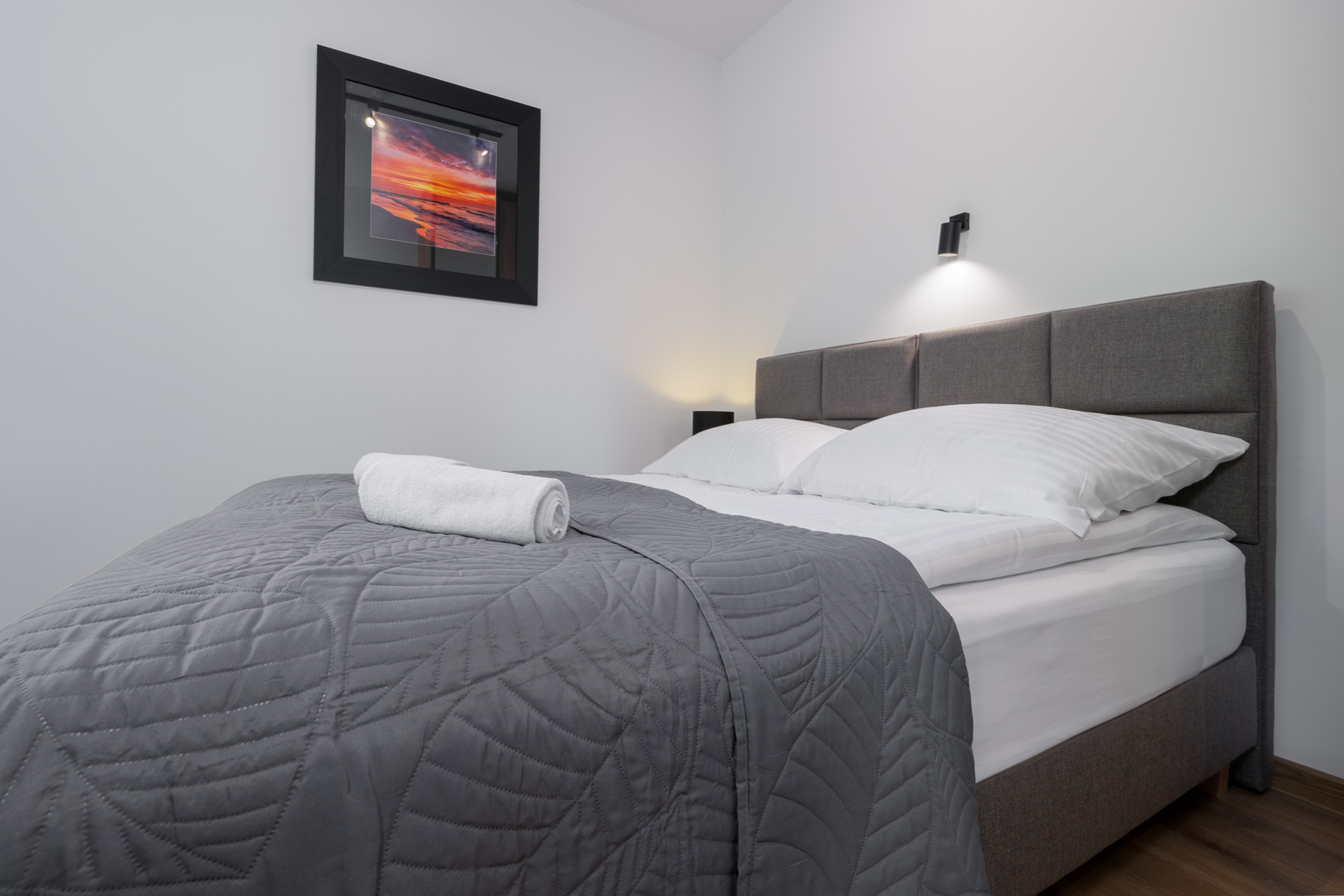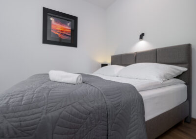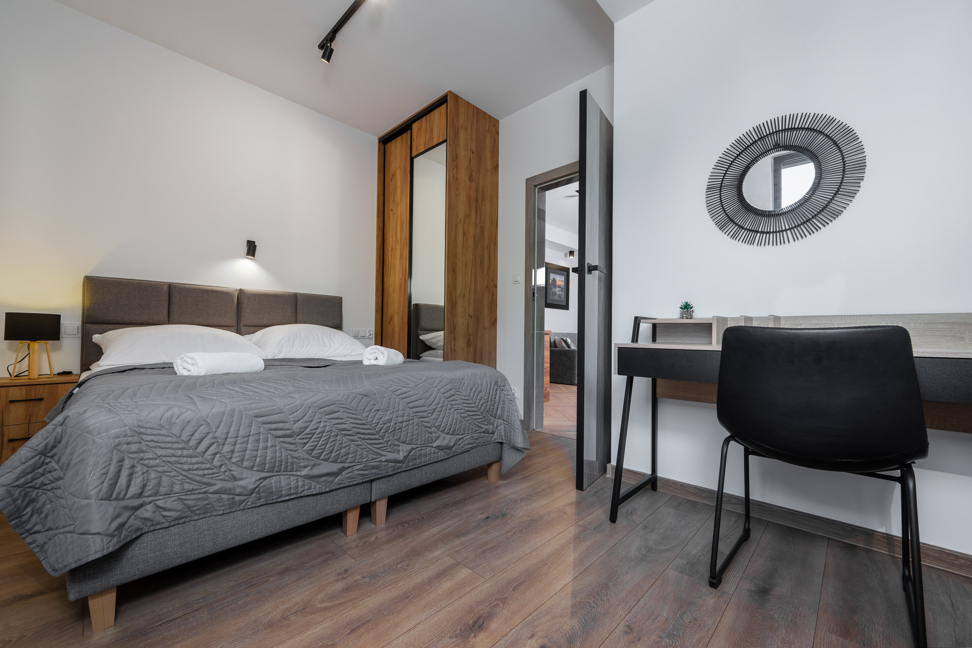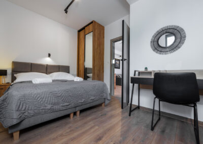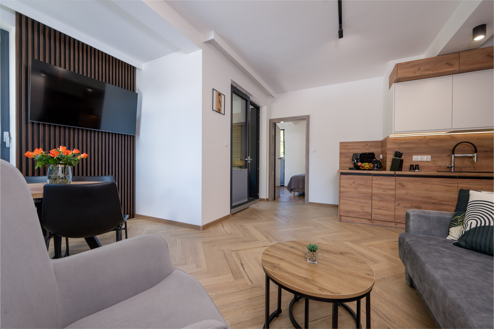 Wyposażony w jedno szerokie łóżko małżeńskie oraz rozkładaną  dwuosobową kanapę w salonie, stolik kawowy, stół z 4 krzesłami,  pojemną szafę oraz dwa  telewizory z płaskim ekranem w systemie smart TV, jednym w salonie  i drugim w sypialni.
