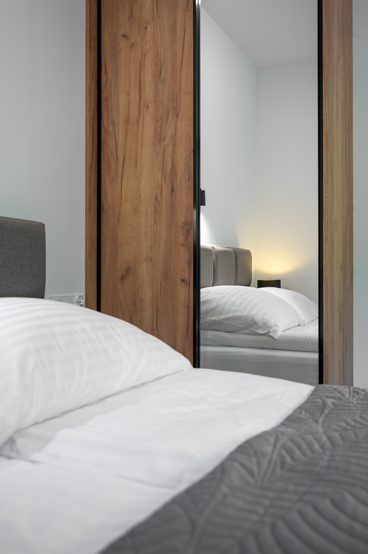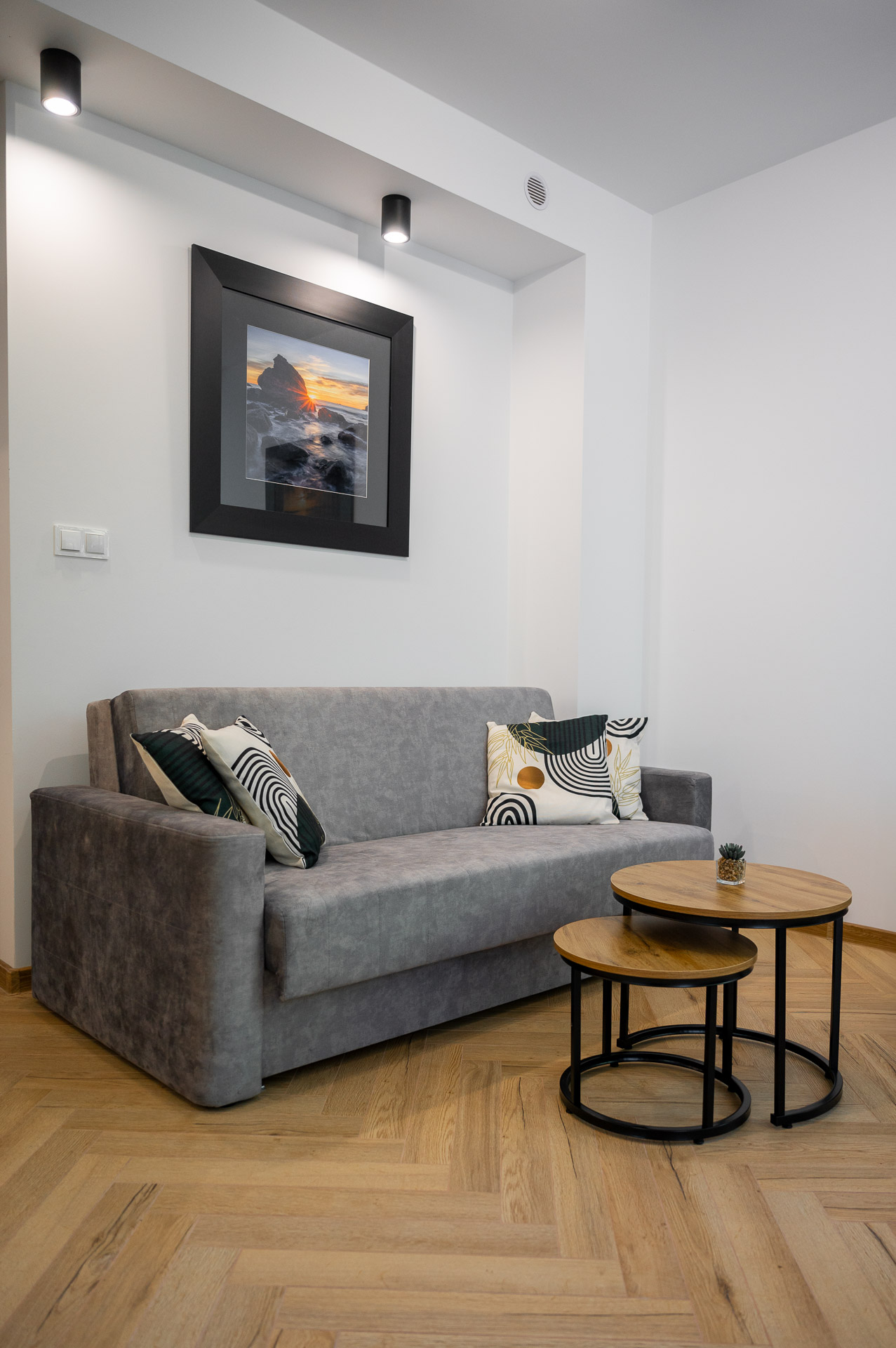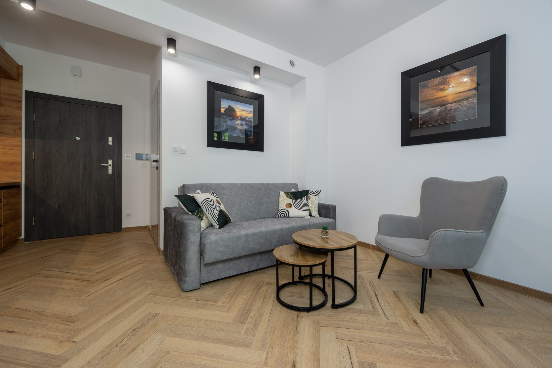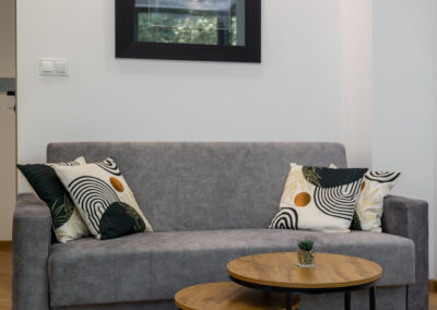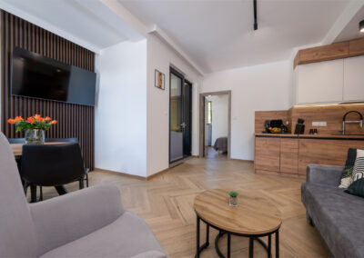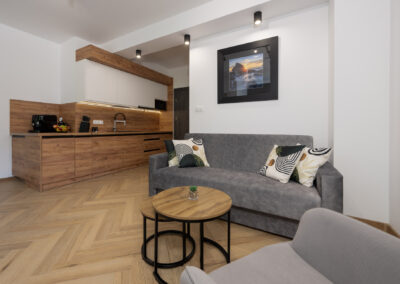 Wyposażony w jedno szerokie łóżko małżeńskie oraz rozkładaną  dwuosobową kanapę w salonie, stolik kawowy, stół z 4 krzesłami,  pojemną szafę oraz dwa  telewizory z płaskim ekranem w systemie smart TV, jednym w salonie  i drugim w sypialni.