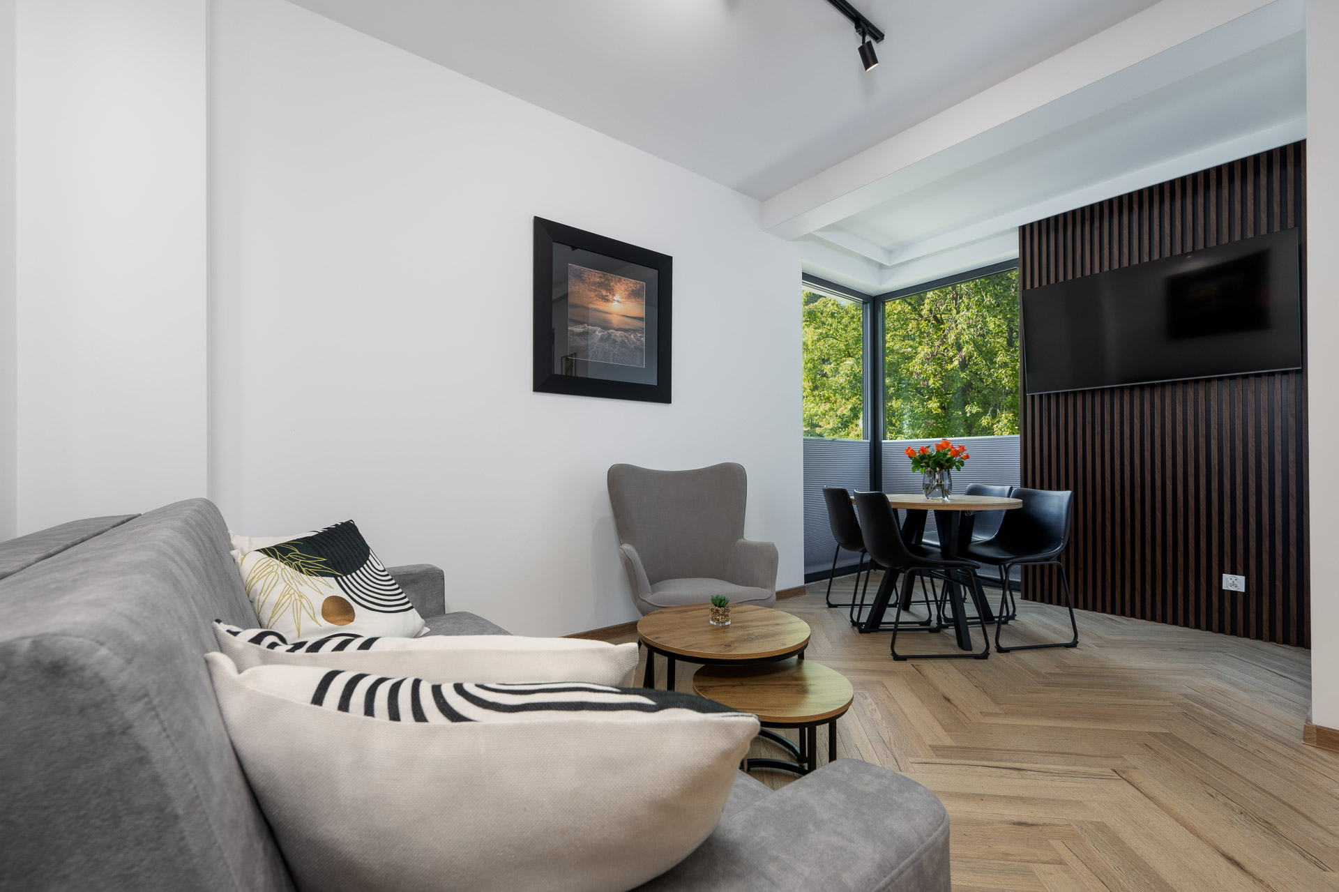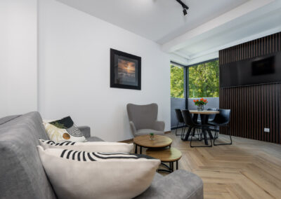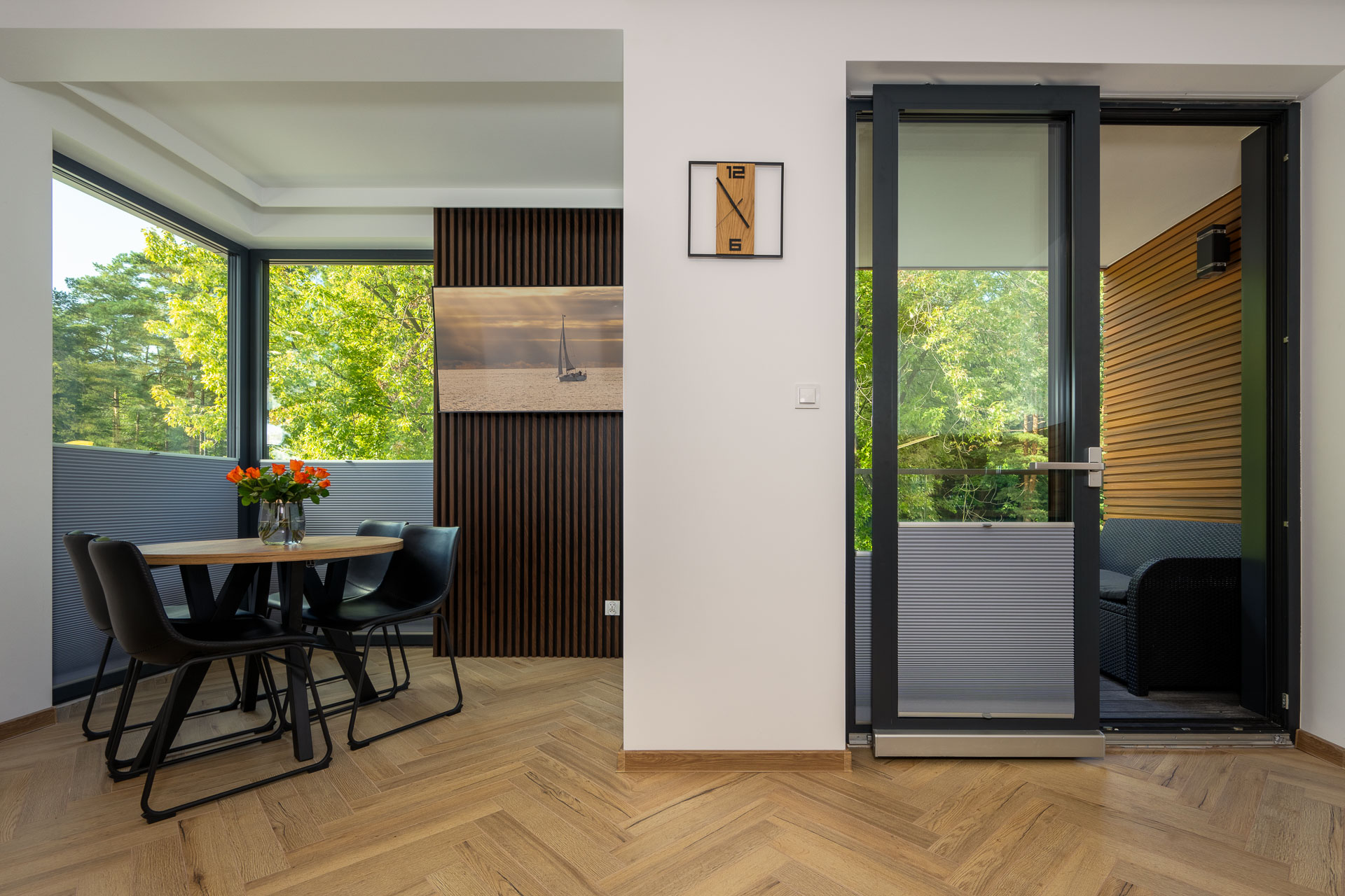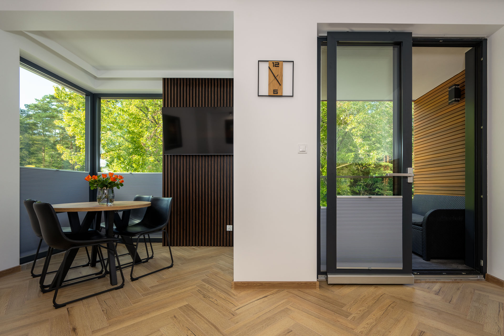 Stylowy, funkcjonalny, zapewniający wygodę i spokój w sercu Jastrzębiej Góry dwupokojowy apartament z jedną sypialnią, przestronnym  salonem z aneksem kuchennym oraz balkonem z meblami ogrodowymi, prywatną łazienką, zlokalizowany na pierwszym piętrze, od strony morza, z widokiem na miasto i ogród. Przeznaczony dla maks. 4 osób.