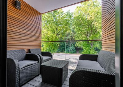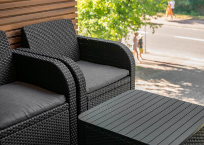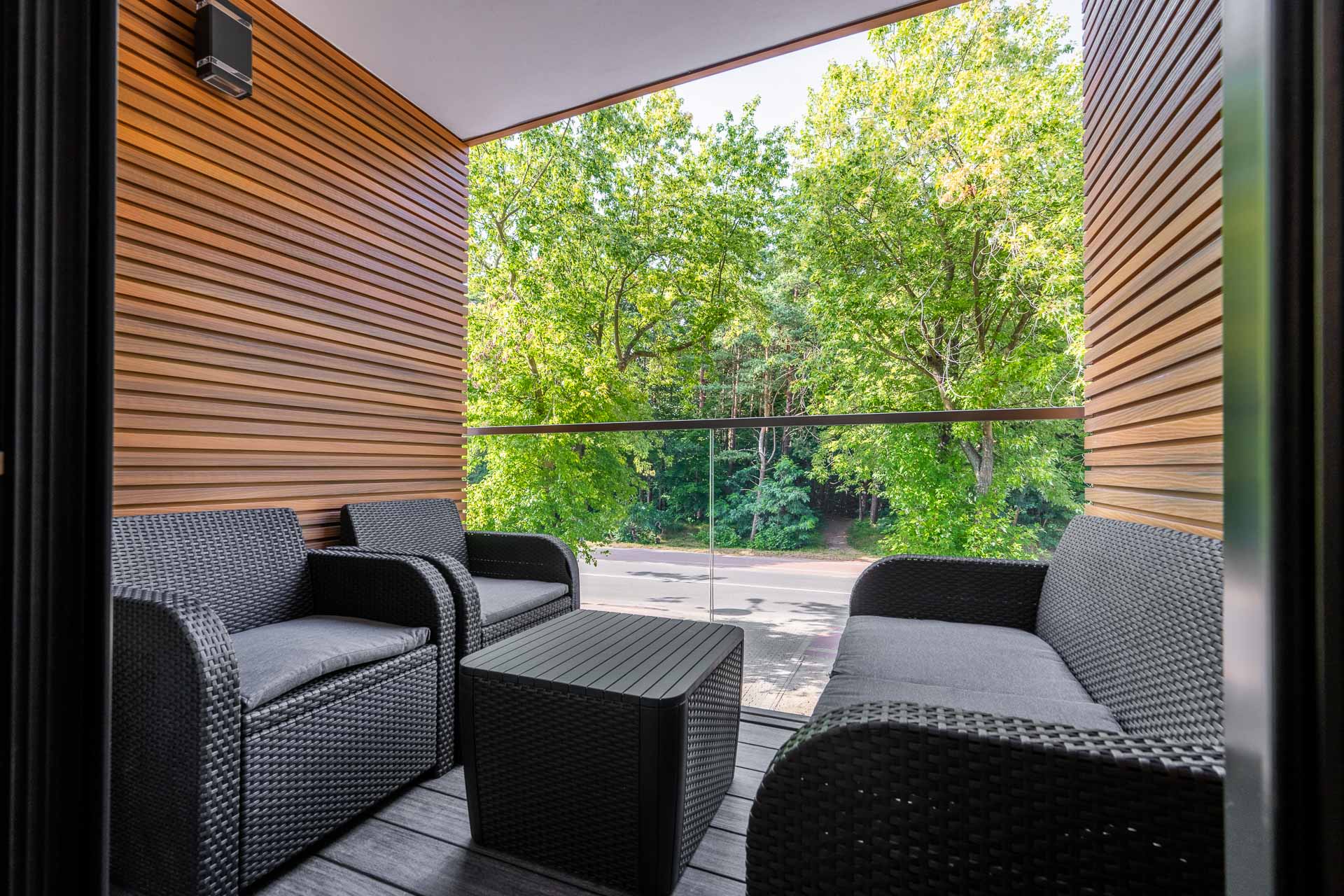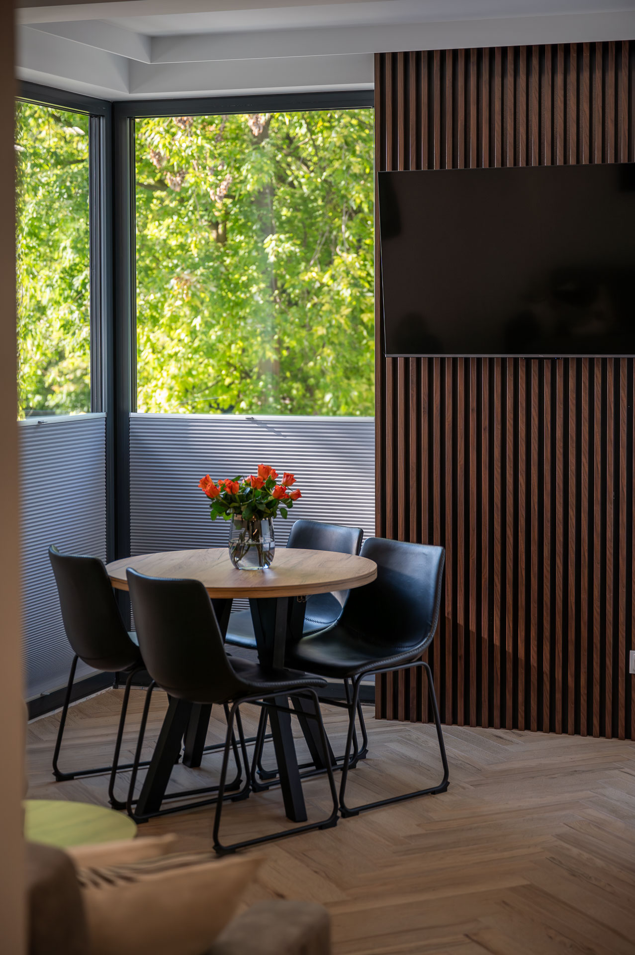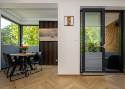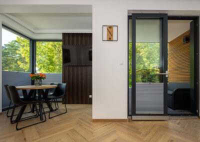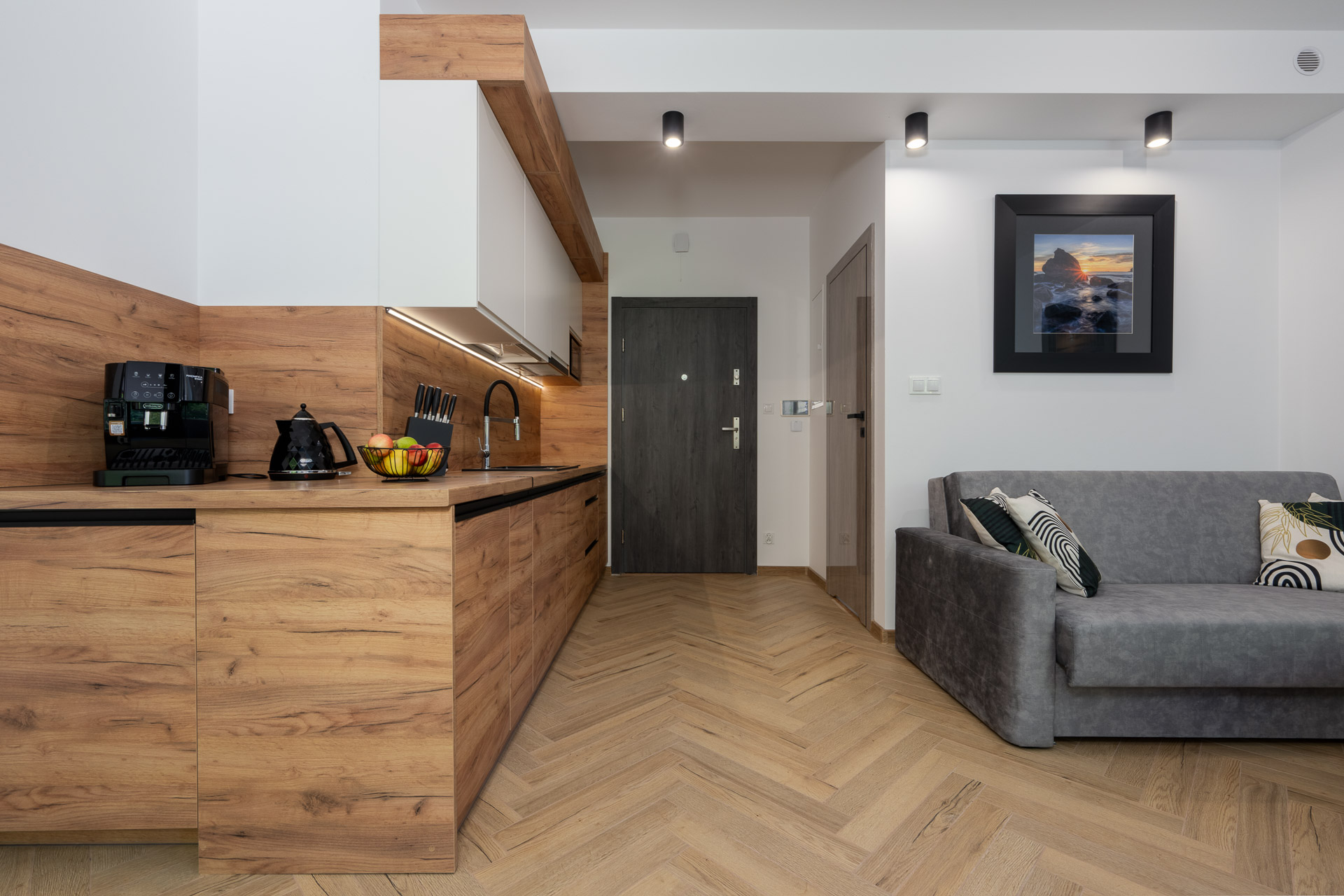 Stylowy, funkcjonalny, zapewniający wygodę i spokój w sercu Jastrzębiej Góry dwupokojowy apartament z jedną sypialnią, przestronnym  salonem z aneksem kuchennym oraz balkonem z meblami ogrodowymi, prywatną łazienką, zlokalizowany na pierwszym piętrze, od strony morza, z widokiem na miasto i ogród. Przeznaczony dla maks. 4 osób.