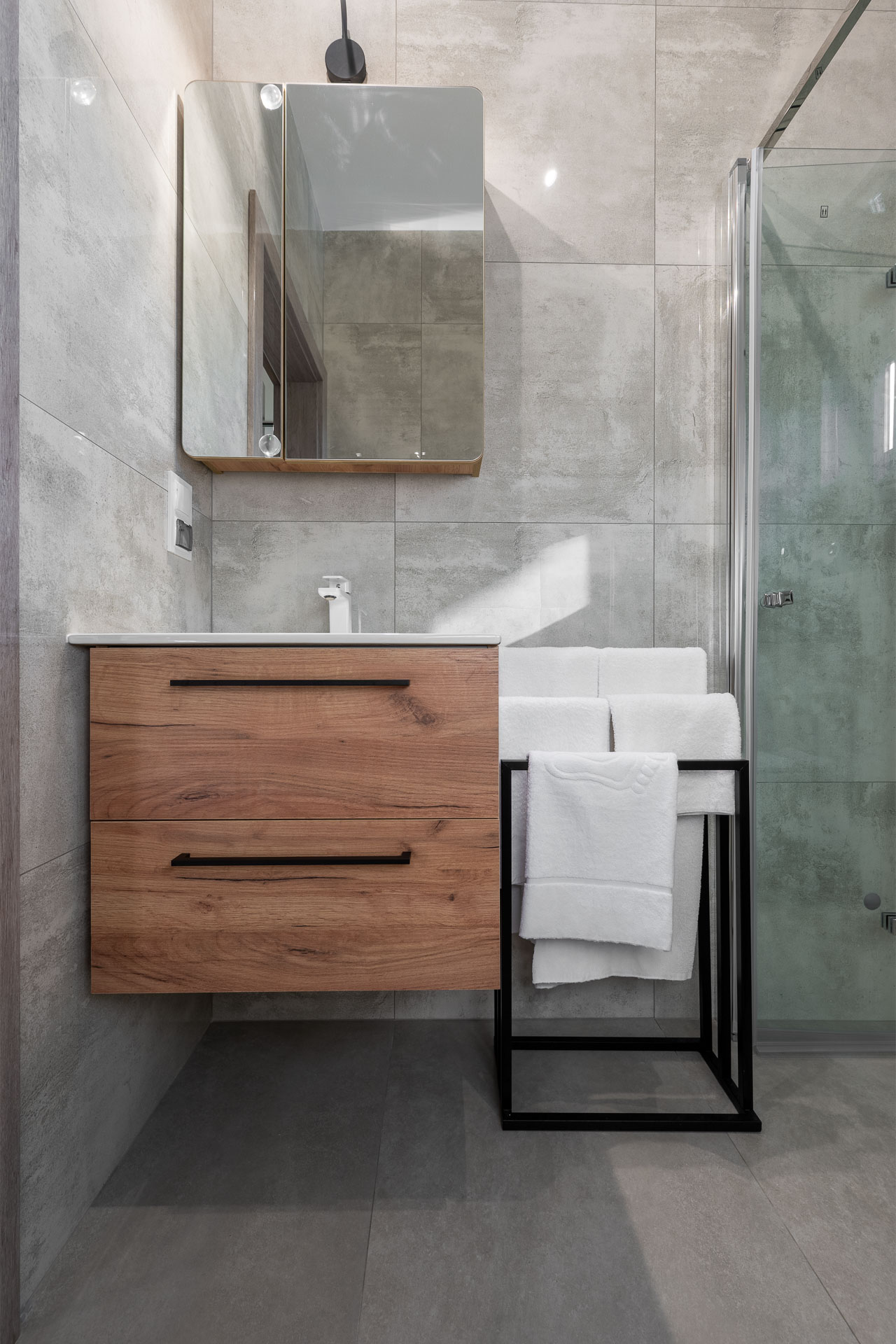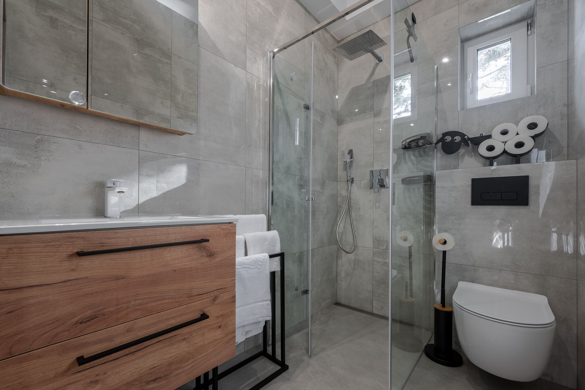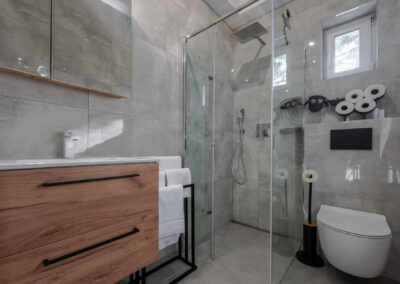 Łazienka z kabiną prysznicową, umywalką i wc.