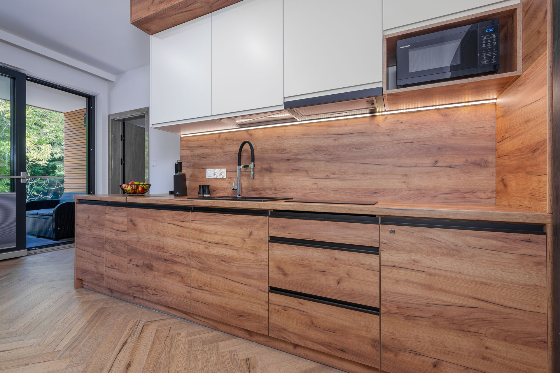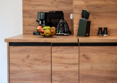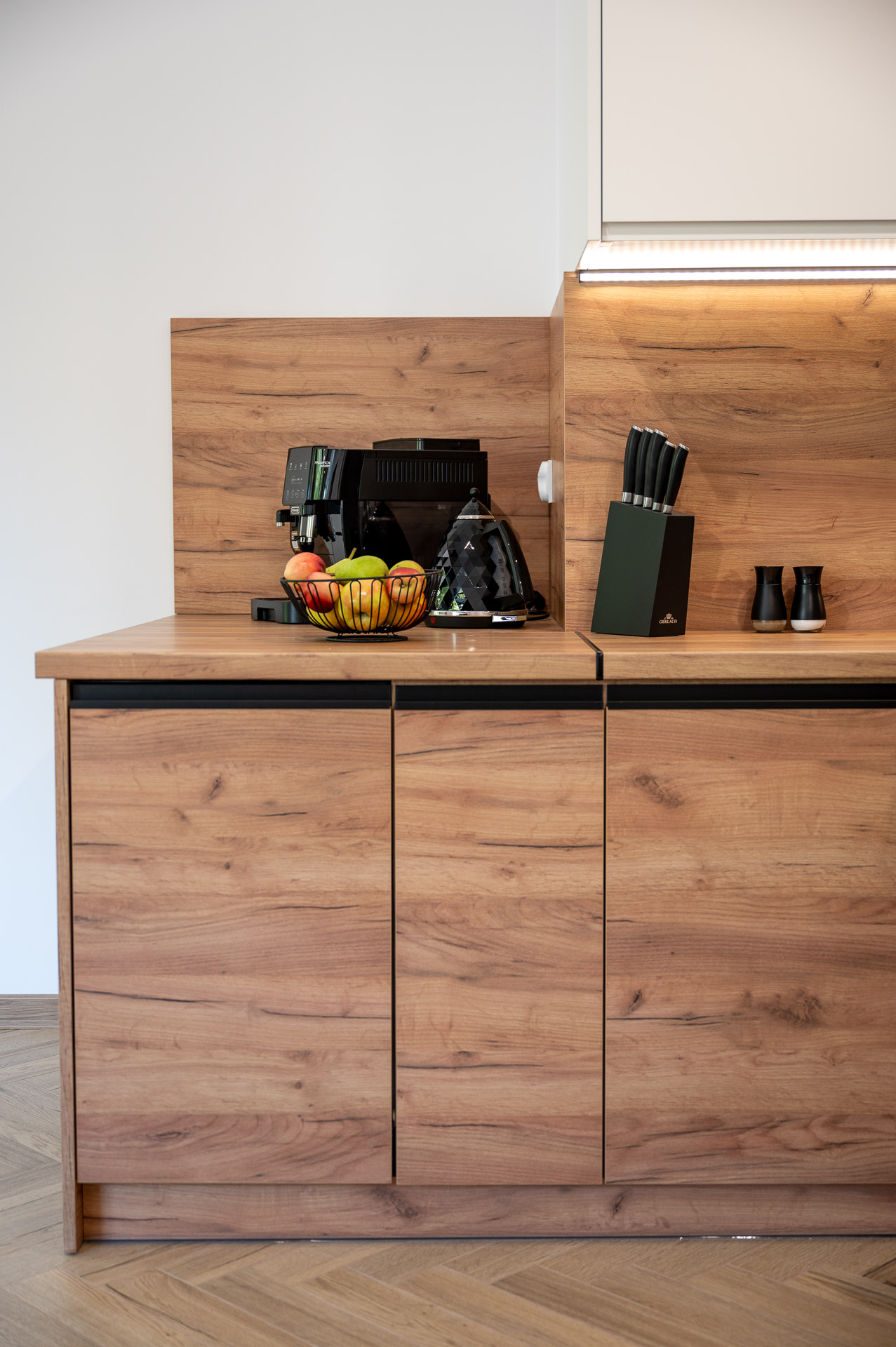 Aneks kuchenny wyposażony jest w płytę ceramiczną z dwoma polami, lodówkę, zmywarkę, kuchenkę mikrofalową, czajnik, ekspres do kawy oraz zastawę stołową, garnki do gotowania i inne akcesoria kuchenne.